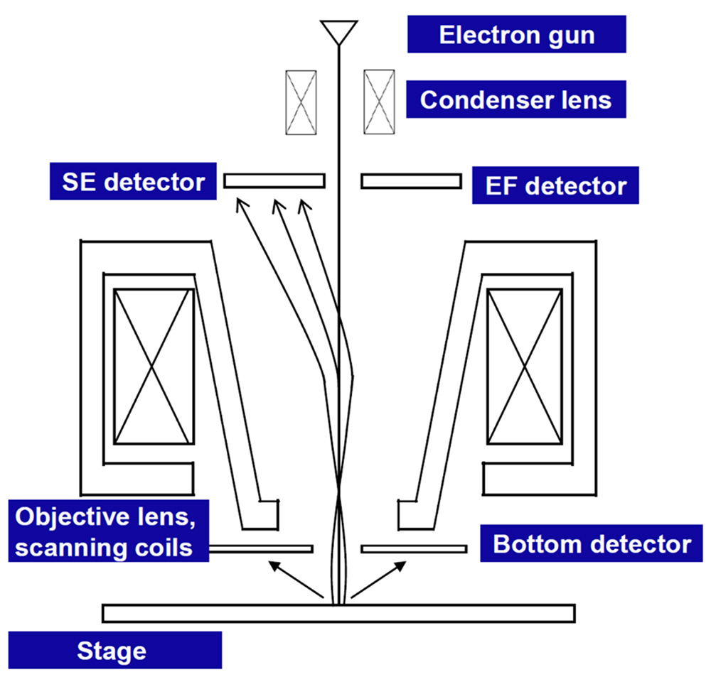 E-beam inspection system consists of components including electron gun, electromagnetic lenses, condenser lenses, objective lens, steerer, detector, backend imaging system, as well as vacuum system and high-vacuum precision motion system. The system structure is illustrated in the following diagram:
